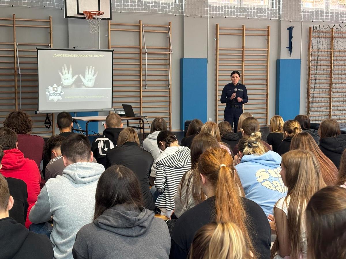 W ramach obchodzonego Europejskiego Dnia Przeciwko Handlowi Ludźmi policjantka z węgorzewskiej komendy wraz z przedstawicielką Powiatowej Stacji Sanitarno-Epidemiologicznej przeprowadziły spotkanie z uczniami szkoły średniej, którego celem było zwiększenie świadomości w zakresie handlu ludźmi oraz zagrożeń wynikających z zażywania substancji psychoaktywnych.