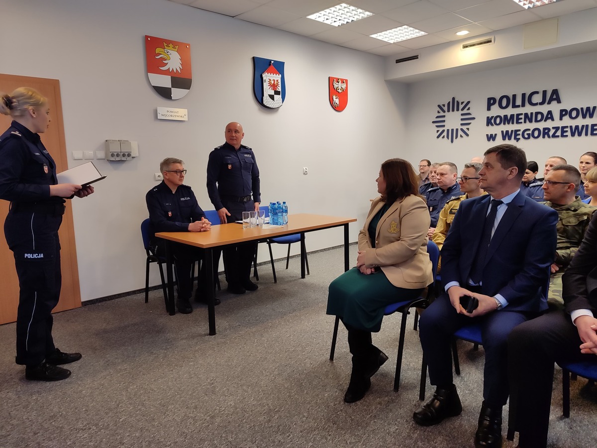 Pani starosta powiatu węgorzewskiego złożyła podziękowania dla pani komendant za dotychczasową pracę na rzecz bezpieczeństwa mieszkańców powiatu węgorzewskiego. Życzyła dalszych sukcesów, a funkcjonariuszom spokoju, stabilizacji i bezpieczeństwa w trakcie służby.