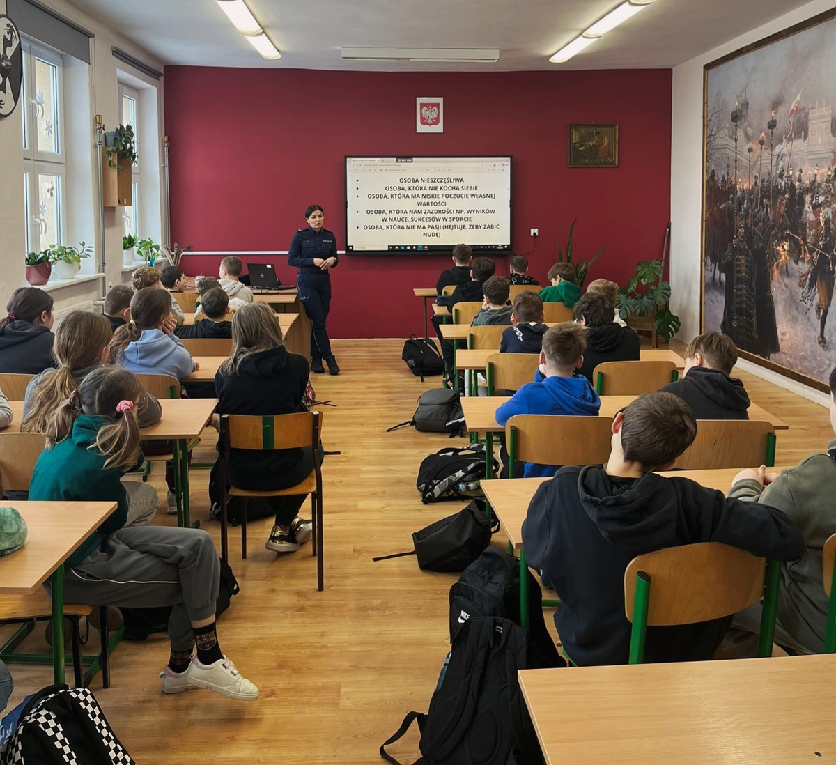 Tematem spotkania z młodzieżą uczącą się w klasach IV i V było uświadomienie młodym ludziom, czym jest hejt oraz w jaki sposób to zjawisko narusza prawa człowieka. Policjantka przestrzegała uczniów przed wyśmiewaniem czy obrażaniem innych za pomocą środków masowego przekazu wyjaśniając, że w internecie nikt nie jest anonimowy, a zamieszczane przez nas treści mogą zostać łatwo skopiowane i wykorzystywane przez inne osoby. Sierż. Magdalena Hrynkiewicz informowała uczniów o konsekwencjach hejtu, w tym odpowiedzialności karnej. Udzieliła wskazówek, gdzie szukać pomocy w sytuacji stania się ofiarą takiego zachowania. Radziła uczniom, aby o wszelkich spostrzeżeniach związanych z zagrożeniami w Internecie dzielić się ze swoimi rodzicami, nauczycielami, pedagogiem. Zalecała, aby z sieci korzystać w sposób mądry i odpowiedzialny.