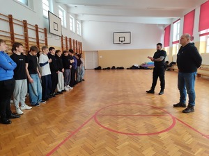 Spotkanie rozpoczęło się od części praktycznej. Instruktor taktyki i technik interwencji przeprowadził zajęcia w formie treningu, podczas którego uczniowie mogli poznać podstawowe elementy działań policyjnych. Młodzież z dużym zaangażowaniem uczestniczyła w ćwiczeniach, sprawdzając swoje umiejętności oraz ucząc się zasad bezpieczeństwa i współpracy w sytuacjach wymagających szybkiej reakcji.
