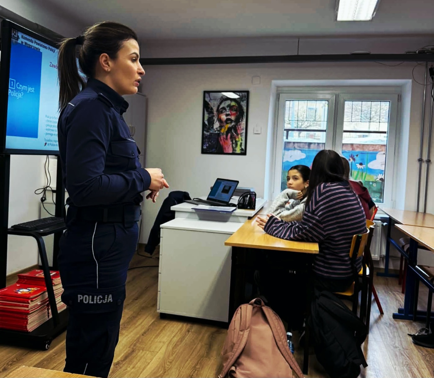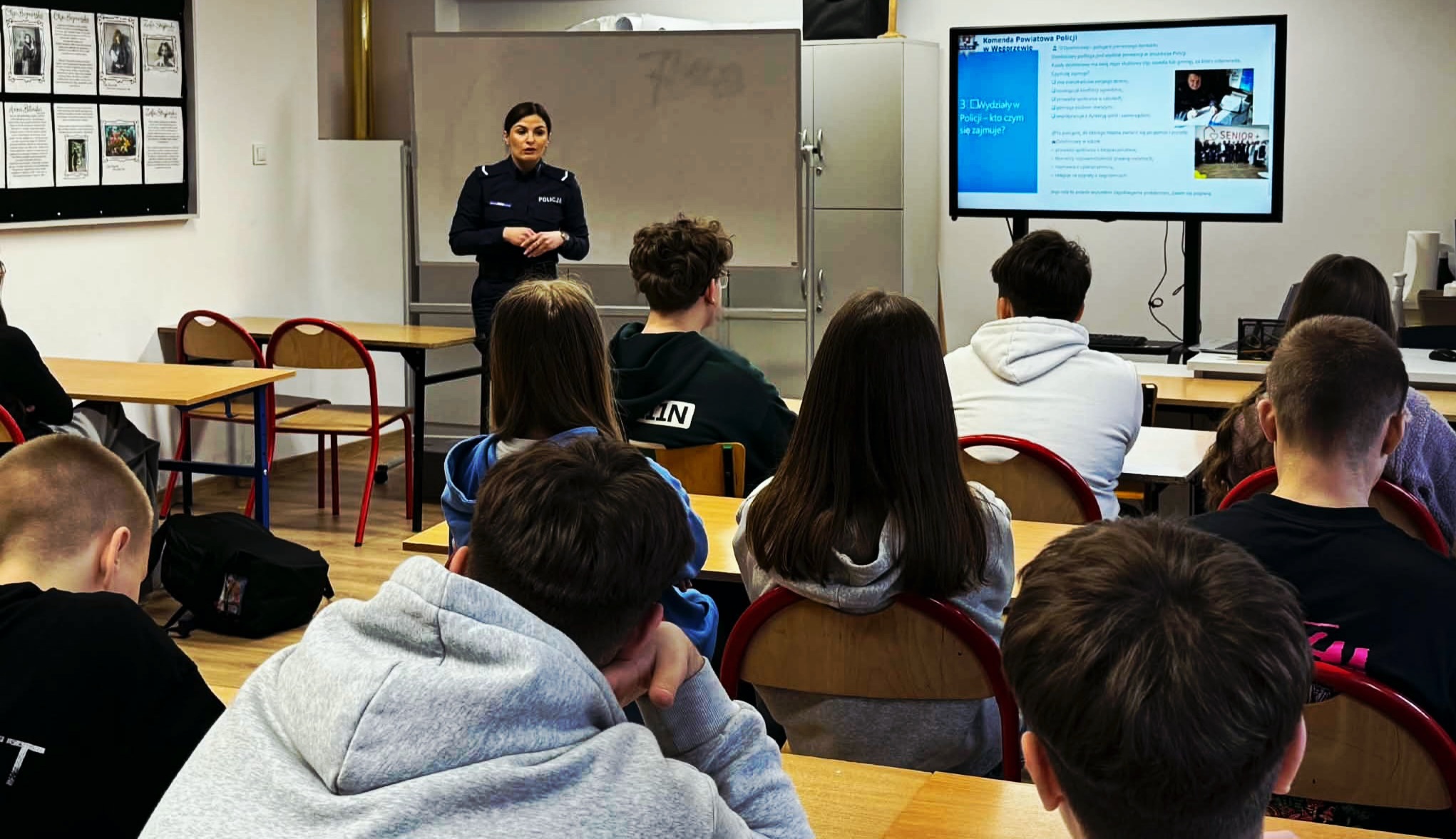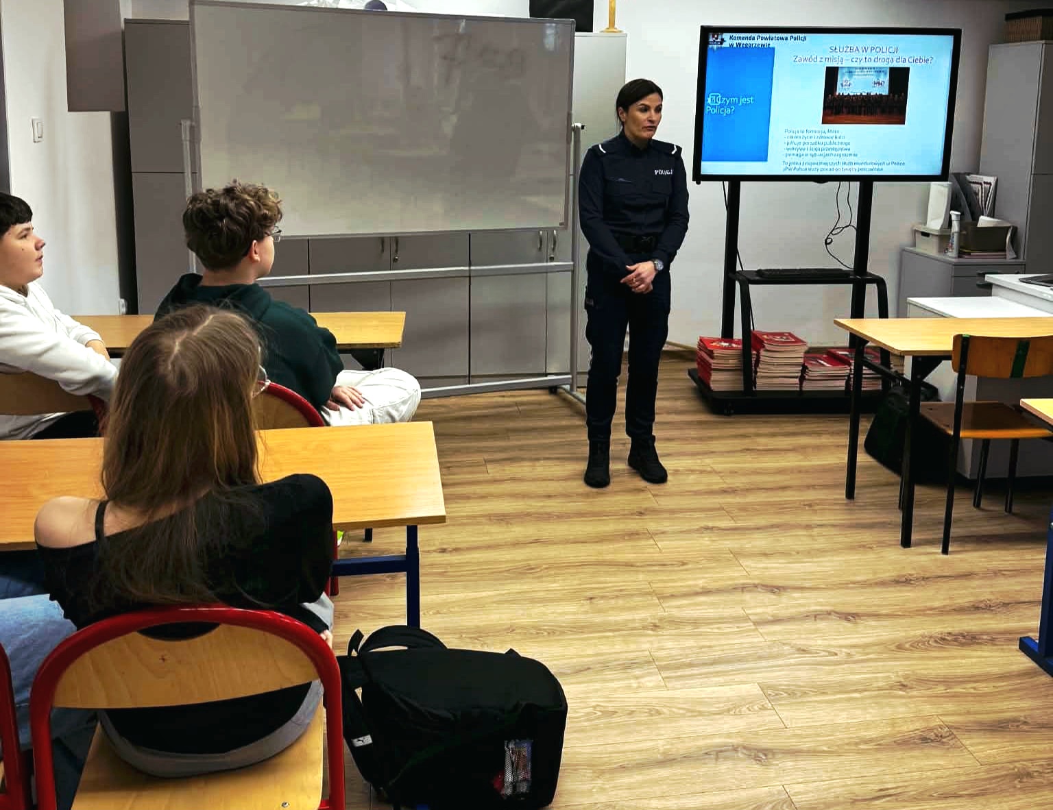 Uczniowie klas siódmych i ósmych Szkoły Podstawowej nr 2 im. Janusza Korczaka w Węgorzewie uczestniczyli w dwóch spotkaniach z funkcjonariuszką Policji. Podczas prelekcji młodzież miała okazję dowiedzieć się, jak wygląda codzienna służba, jakie są wydziały w strukturze formacji oraz jak przebiega proces rekrutacji do Policji.
